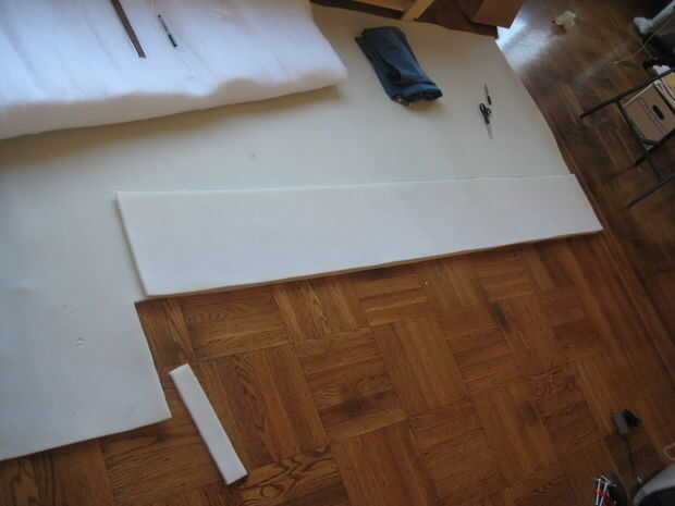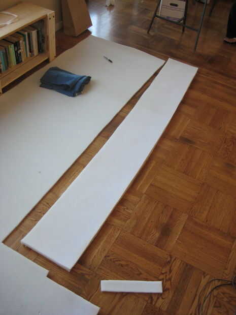 hicimos este banco para el vestíbulo de nuestro negocio. Sabíamos necesita amortiguadores, pero no tenía el presupuesto que una costurera hacer para nosotros. Después de explorar opciones, encontré algunas ideas en Pinterest y combinado para crear la
