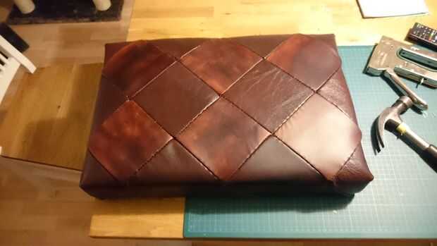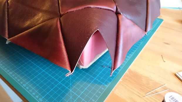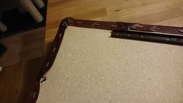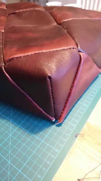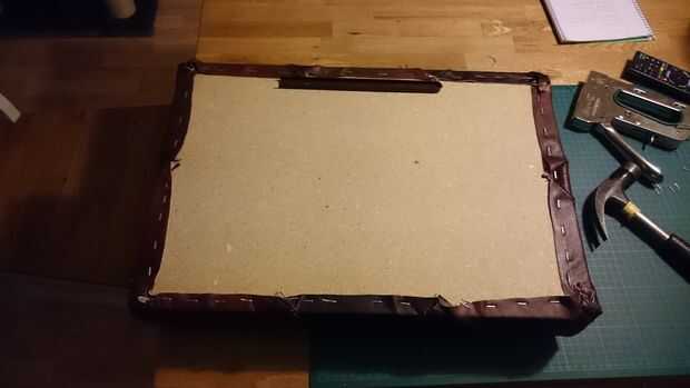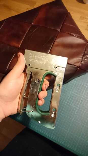 The sewing is now finished! Sólo las esquinas de izquierda. I ajustar la pieza para el cojín, había estirada hacia fuera y utiliza una pistola de grapas para fijarlo. Un martillo fue utilizado ya que las grapas no ir todo el camino.