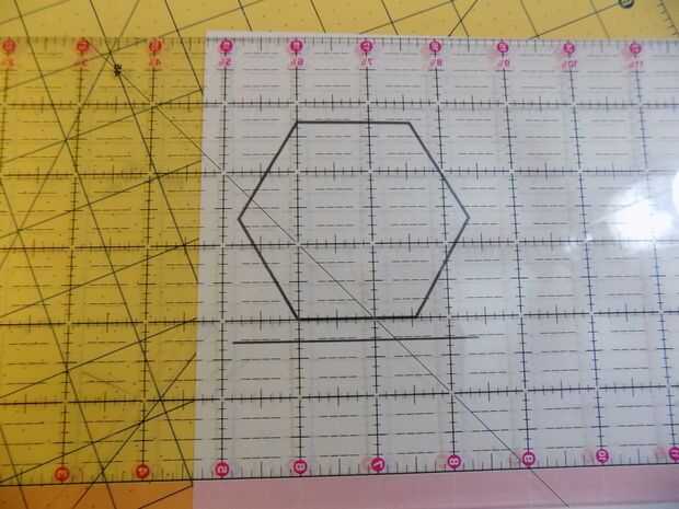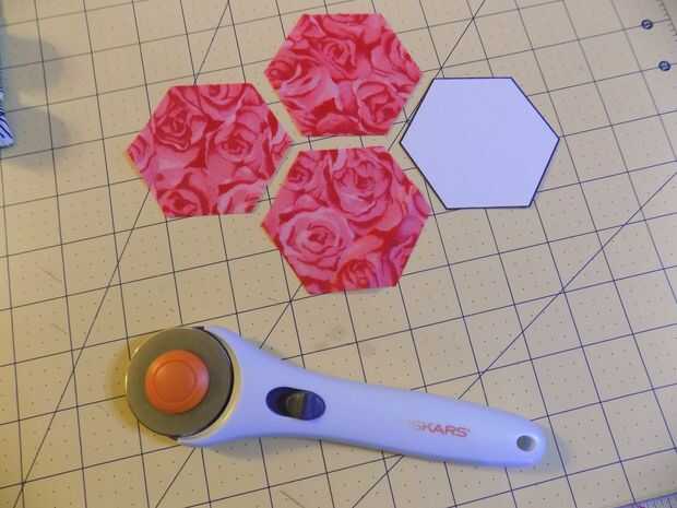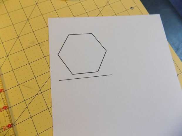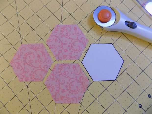 Utilice la impresión como plantilla para cortar seis hexágonos de tela de algodón. Cortar tres de cada uno de los dos tejidos diferentes.