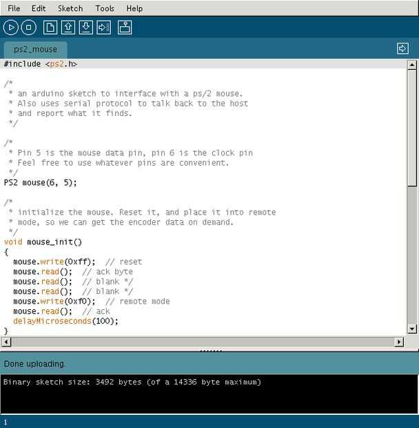 A continuación encontrará un esquema de karduinoss.pde para el arduino basada en la biblioteca de ps2 en http://www.arduino.cc/playground/ComponentLib/Ps2mouse que inicializará el teclado como controlador absoluto xy con ~ 4000 pasos de lado a lado.