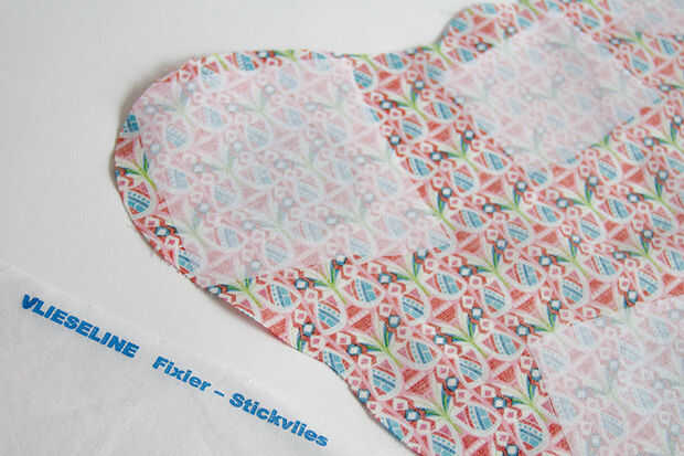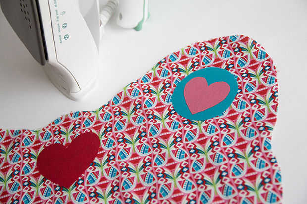 Comenzamos mediante la preparación de la aplicación. Hierro una pieza de doble cara (hemos usado Pellon 805 de maravilla en papel) la entretela sobre el revés de la tela que desea utilizar para sus motivos y luego recorto mediante el diseño de corazón y círculo se muestra aquí, o hacer su propio patrón. Coloque los adornos en la pieza frontal de la mariposa y hierro en el.