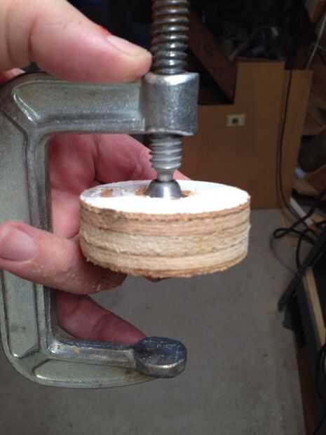 El cono en el tornillo es 3/4 de pulgada de diámetro. Taladré un agujero poco profundo 3/4 de pulgada de diámetro en el centro del disco de madera contrachapada. Luego perforé este agujero un poco más para el ajuste, pero habrá más sobre eso más adelante.