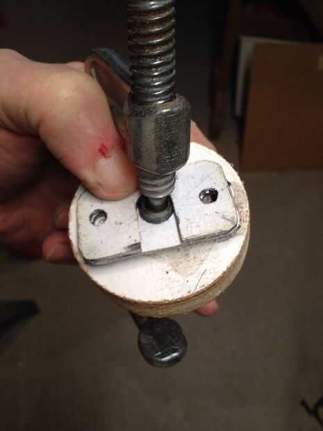 Deslizar las piezas del metal de hoja alrededor del cono del tornillo de la abrazadera. Si el ajuste es muy apretado, que el orificio de 3/4 de pulgada un poco más el cono va hacia abajo en el disco un poco más lejos.