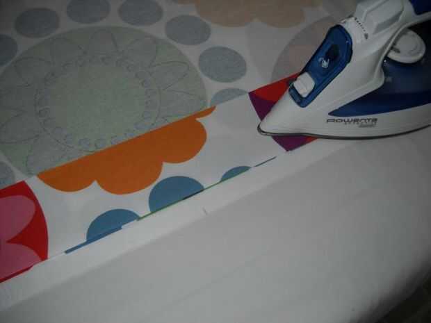 Hierro plano. Medida reducir la cantidad de tela. Por ejemplo, quería un 43 cm de ancho, así que cortar 2 cuadrados de 43 cm y 2 cm para el dobladillo.