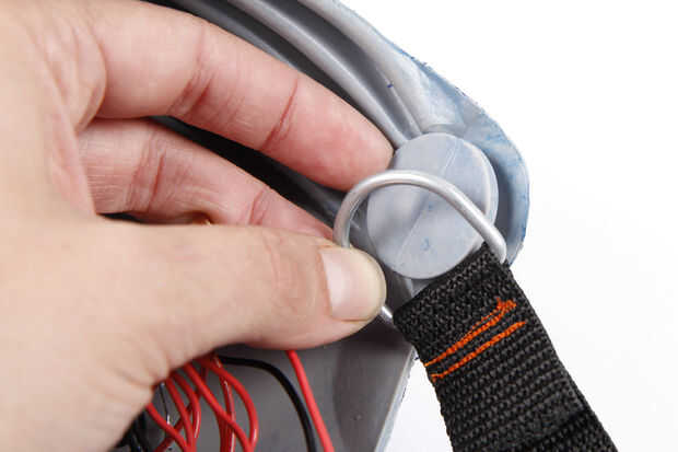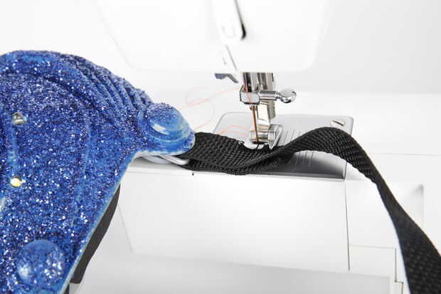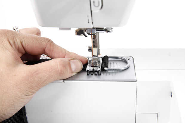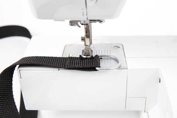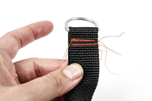 I rosca algunas correas a través de cada anillo en D y luego utiliza una máquina de coser para cerrar los lazos de las correas.