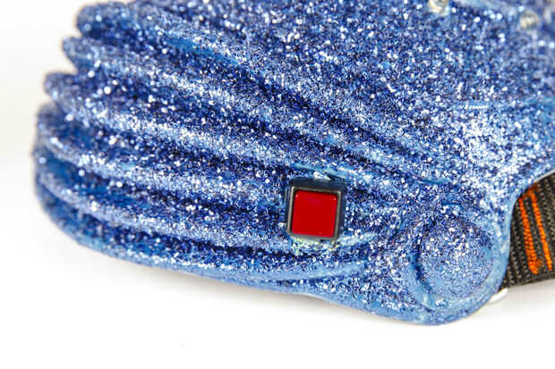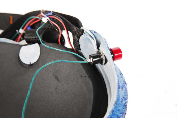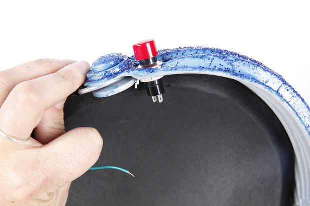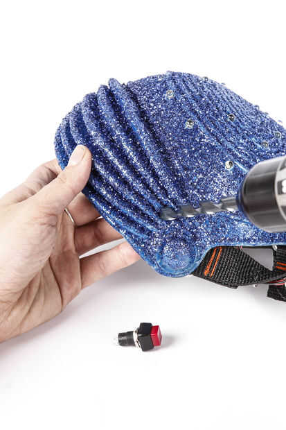 Utiliza una broca grande para perforar agujeros en las esquinas interiores de las hombreras, y había roscada de botones a través de cada uno. El botón cuadrado actuó como mi interruptor, y el redondo fue mi selector de modo.