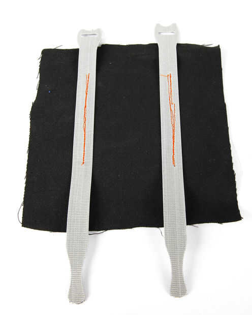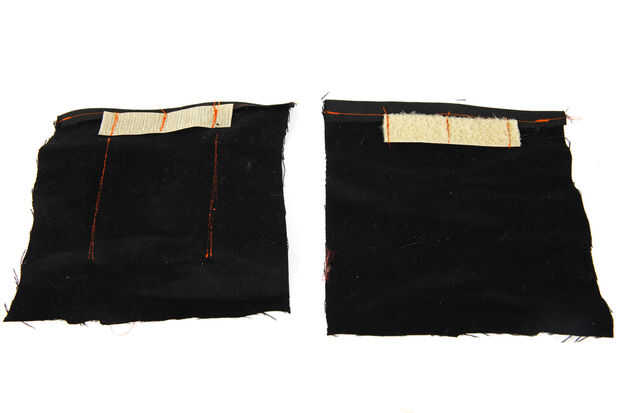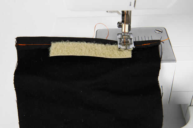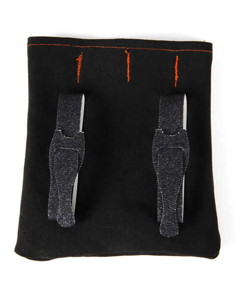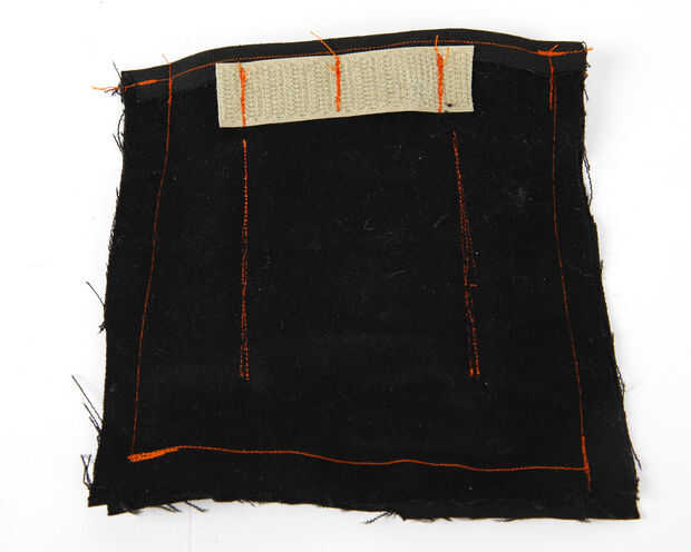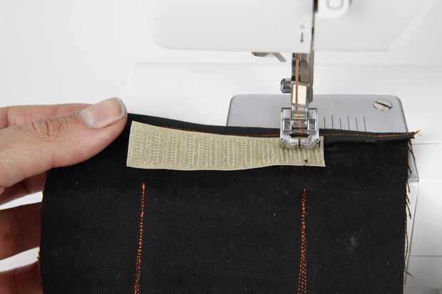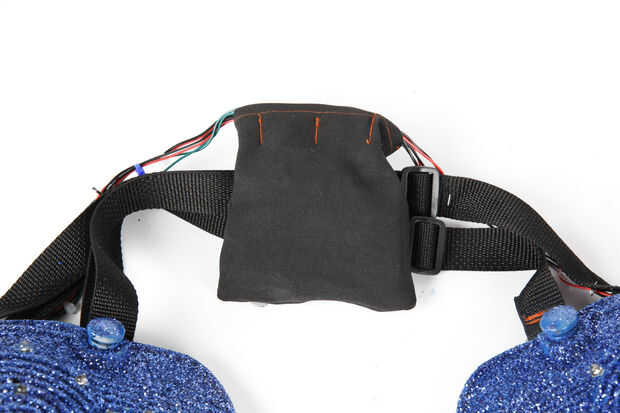 Con algún retazo de mezclilla tenía por ahí, hice una pequeña bolsa para todo el cableado y circuito en. Cosí dos tiras de cierre rápido de velcro en la parte exterior de la bolsa para que se anide y deslice las correas de las hombreras. Sella la bolsa con unas tiras de velcro más.