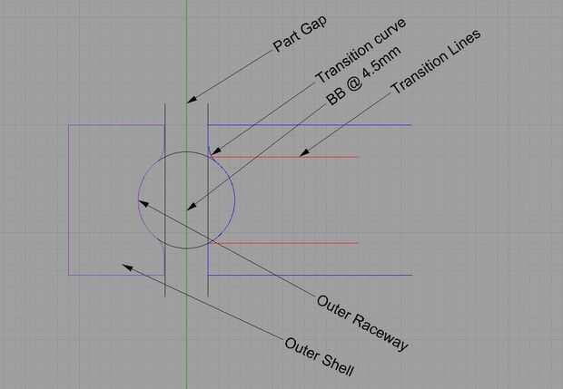 Para aquellos interesados en la construcción de sus propios rodamientos de bolas, he subido un DXF 2D del perfil de que uso. En su programa de CAD, puede modificar la profundidad y giran en el perfil para hacer apenas sobre cualquier conjunto de cojinete de bolas de tamaño que usted necesita.