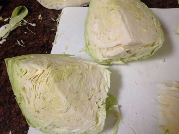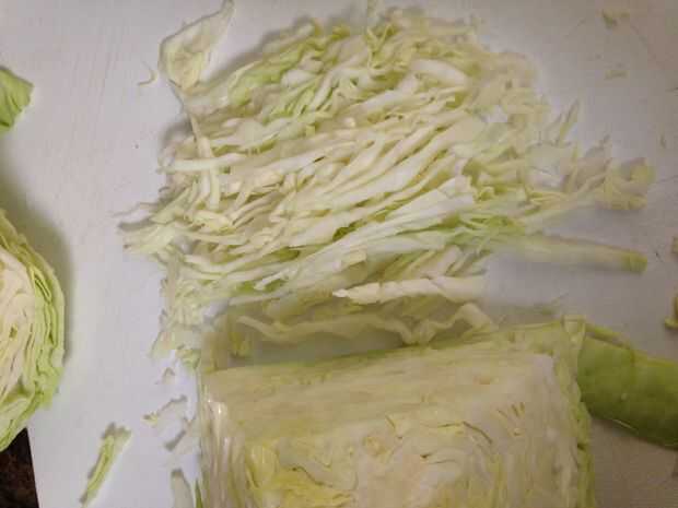 2. mientras se está dorando la hamburguesa, finamente rebanada el repollo. Uso rodajas muy finas porque he encontrado que las personas que no les gusta repollo cocido se dan vuelta de por la textura no el sabor. En el proceso simmering de que la col se cocina hasta el punto es casi imperceptible.