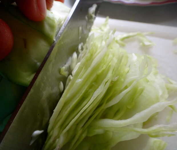 Usted cortar repollo tan fina como usted puede conseguir. Este es el paso más difícil en el plato entero.