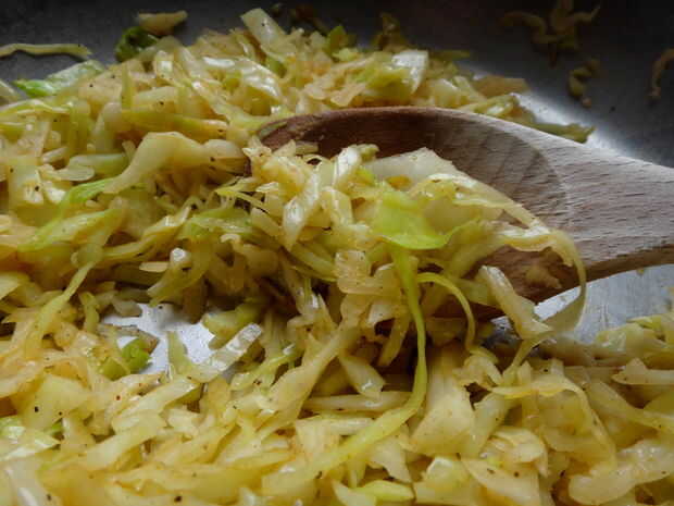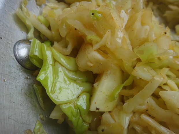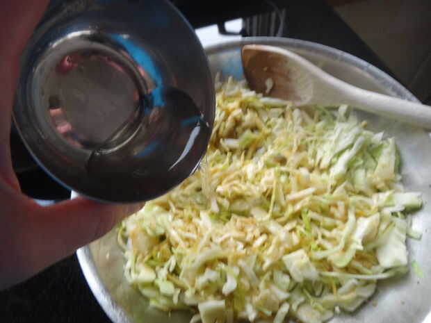 Agregar la col en rodajas fina, agitar durante un minuto para calentarla. Use temperatura alta, quieres el agua + vinagre mezcla a chisporroteo.