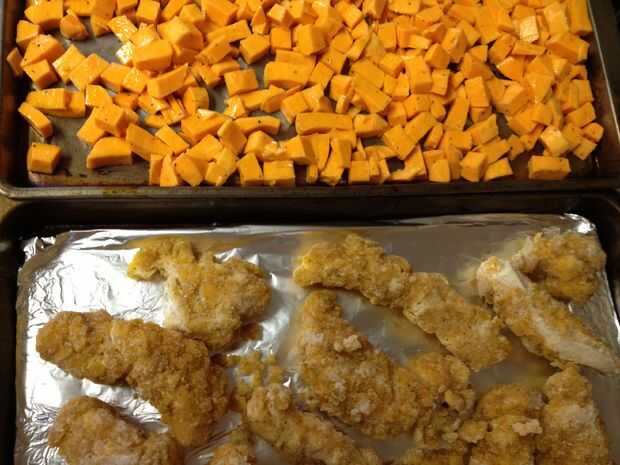 Si no desea utilizar las tiras de pollo empanado puede optar por no empanizados. Si usted decide usar pechugas de pollo frescas y el pollo el pan tú mismo, necesita aumentar el tiempo de cocción. También deberás hornear el pollo y batata por separado. Si no se sobre cueza al horno las patatas y posiblemente quemarlos. Siempre cocine pollo fresco con un grado interno de 165.