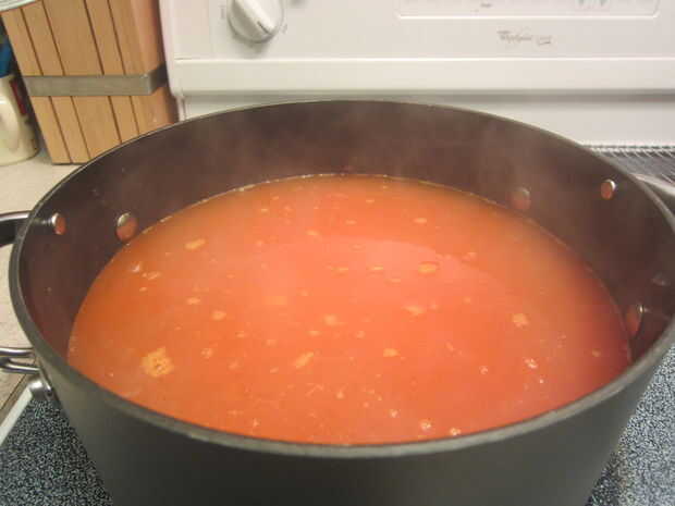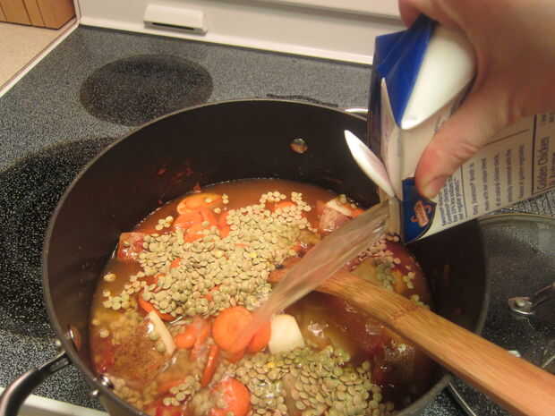Después de agregar las lentejas, es el momento de verter el pollo caldo (caldo de verduras o agua).  Como un cartón de caldo es generalmente solamente 32 onzas o 4 tazas, suelen añadir otra 2 tazas de agua.  Si usted prefiere usar caldo de todos, funciona también.  Y si tienes caldo casero o caldo en mano, que sería fantástico aquí.  Para un impulso de proteína agregada, usted puede también revolver en los garbanzos en este punto.