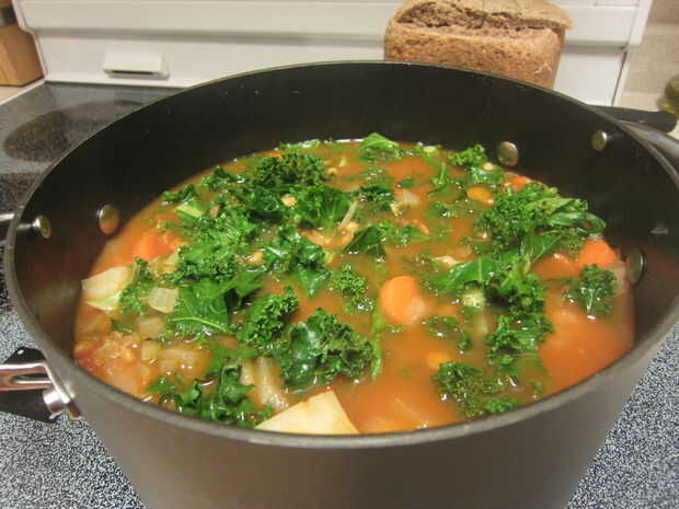 A continuación, suavemente agregue la col rizada u otros verdes.  Deje que hierva a fuego lento otros 5-10 minutos, hasta que las patatas son de horquilla-curso.
