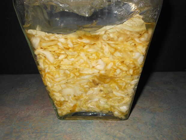 cientos (quizá miles) de años atrás, la gente descubrió que si utilizan sal, podrían conservar los alimentos cosechados en el otoño para usar durante el invierno. Uno de los alimentos conservados que es col, y el resultado es un producto fermentado que llamamos chucrut. Me encanta el chucrut. Cuando fui creciendo, recuerdo que mi mamá toma col cultivada en nuestro jardín, poniendo en una vasija y después embotellado el sauerkraut resultante. Me encanta el chucrut. No me di cuenta de que puede usar un tarro de cristal que no tienes que tener una olla. Estaba tan emocionada. No tengo que hacer un montón, soy el unico en mi familia que lo comerán, y asique basta para hacerme feliz, en mi tarro de forma divertida. Chucrut!
