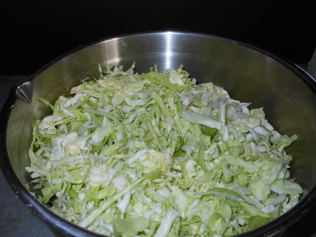 Coloque la col finamente rebanada en un recipiente grande.