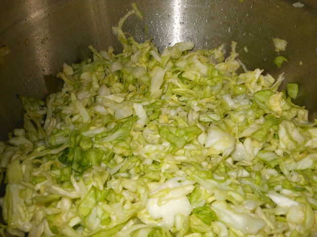 Con las manos impecablemente limpias mezcle la col y la sal juntos.  Hacer esto durante unos 3 minutos.   Líquido debe venir de la col.