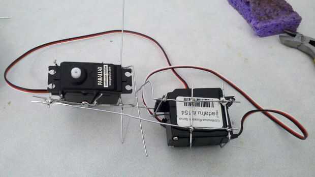 Nota: Si estás haciendo los motores servo doble tienes que soldar entre sí dos cajas de cada servo y fíjelos juntos alineándolos y ellas girando 90 grados. Por ejemplo si el motor superior se enfrenta a formas frente a usted que el motor parte inferior estaría enfrentando al lado. Usted quiere soldar las cajas entre sí hasta que estén muy robustos y no va a mover alrededor mientras la cola esté en movimiento.