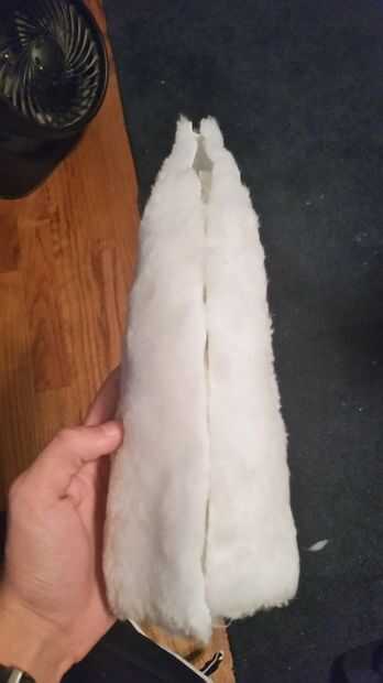 Para ello, empezar por correr una gota de pegamento en la parte superior de la cola. Es muy importante hacer primero la parte superior porque se verá mucho más bonito en el extremo. Ahora, presione el lado pegado en el centro de un pedazo de la piel que sea lo suficientemente grande como para cubrir la cola entera. Para permanecer en el lado seguro, deja alrededor de una pulgada de material adicional en todos los bordes para evitar desperdiciar material. Asegúrese de esperar a que el pegamento se endurezca antes de trabajar lentamente su camino alrededor de la cola. Aplicar una línea de pegamento, sostenga a la tela hacia abajo en su lugar y mover hacia arriba en ambos lados.