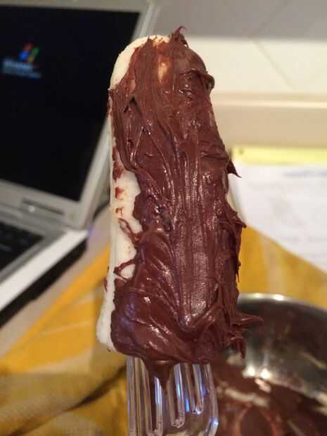Poner el chocolate en 1/2 del plátano con el chocolate derretido o puede poner el chocolate en un tarro de masón y sumergir el plátano allí