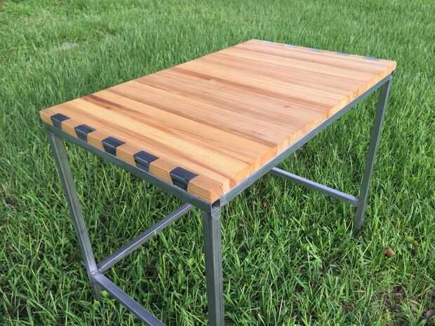 Hice este escritorio de madera de mi patio madera y tubo de acero cuadrado de 1 pulgada de The home depot. Usé un jig casero de sierra circular para cortar colas de Milano de metal imitación de la madera para unir el acero.
