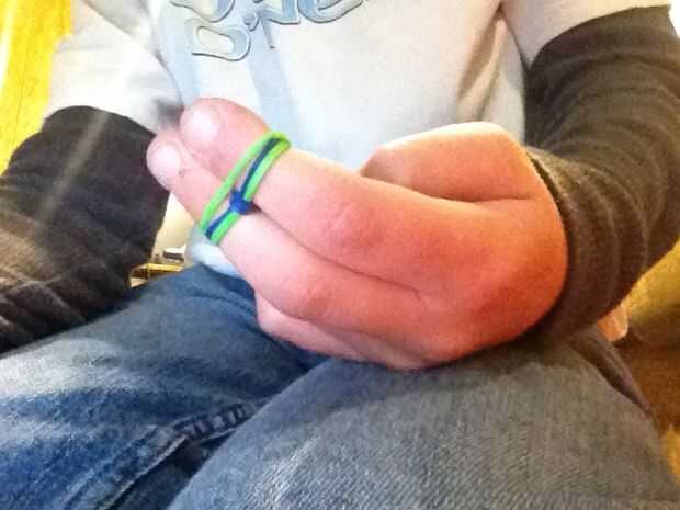 manera fácil de hacer una pulsera de cola de pescado en cualquier lugar.Paso 1: materiales Todo lo que necesitas esSu elección de colores de gomasy un clip C o SPaso 2: Poner la primera banda de goma de color en una figura de ocho en los dos dedos. P
