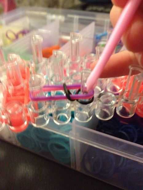 manera fácil de hacer una pulsera de cola de pescado en cualquier lugar.Paso 1: materiales Todo lo que necesitas esSu elección de colores de gomasy un clip C o SPaso 2: Poner la primera banda de goma de color en una figura de ocho en los dos dedos. P