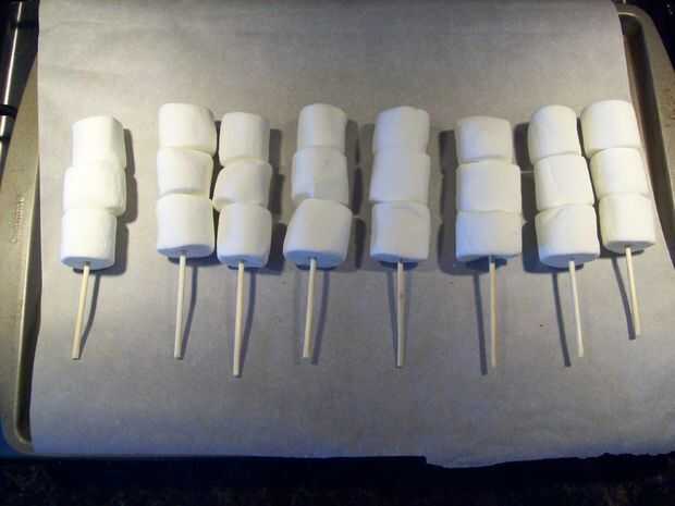 Coloque tres malvaviscos sobre los pinchos empujando la brocheta por el centro de cada uno. Si no has hecho ya, la brocheta hasta 6 pulgadas de corte y asegúrese de que la punta se ha ido.
