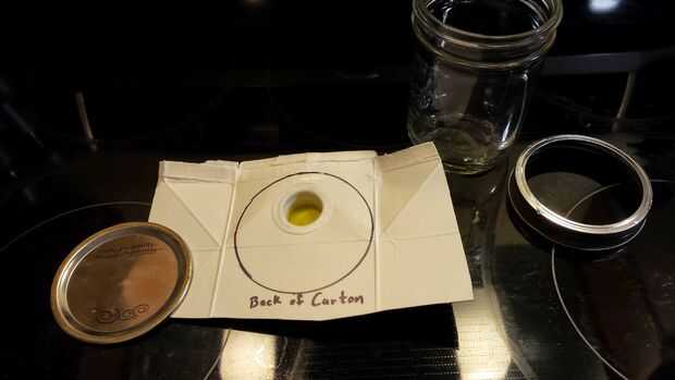 Tomar la inserto tapa de tarro de masón y traza en la parte posterior de la caja de cartón. Asegúrese de que cuando usted recortar, seguir de cerca a la línea. Si tu corte es ligeramente más grande que el relleno del tarro de masón, está bien. Si es menor, corres el riesgo de tener una fuga si vas a usar un líquido.