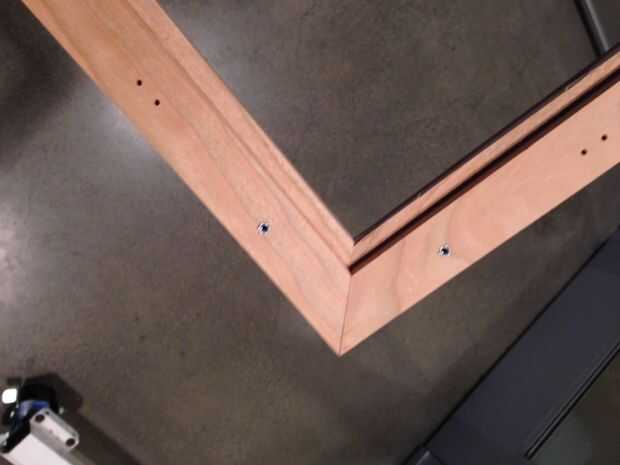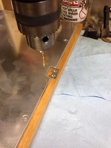 Sujetan el aluminio para el marco de madera y taladrar los orificios guía para los hilos de rosca usando un drilllpress. Luego se retira el aluminio y orificios suficientemente grandes para sostener que el metal de las pisadas que yo entonces golpeado en mi marco. Los hilos me permitirá que Atornille y desatornille el conjunto sin dañar la madera.