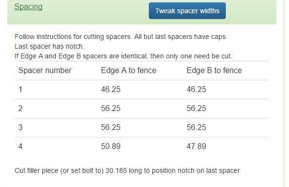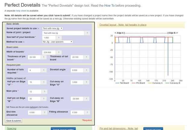 Necesita decidir cuántas colas que desee, pero siempre puede cambiarlo si quiere. También necesitará decidir el ángulo de la cola de Milano a utilizar. Recomiendo utilizar un número entero de grados (que lo hace más fácil ver en el indicador de inclinación de mesa Sierra de cinta). 8 grados es aproximadamente 1:7, que es un buen ángulo para todo uso. Poner estos datos en la calculadora de la herramienta de diseño. Por cierto, es perfectamente posible utilizar un ángulo de la cola de Milano de cero para hacer un dedo conjunta, pero tenga en cuenta los comentarios en la sección "Ajustes".