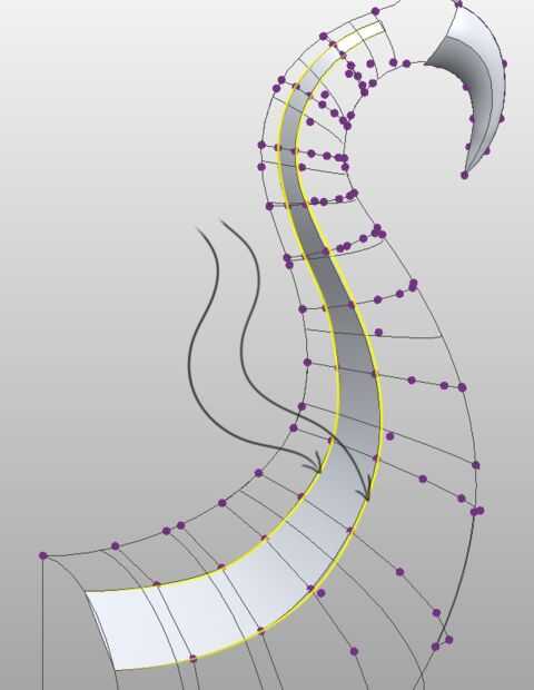 Con esa línea 3D dibujada en la superficie del formulario, entonces podríamos crear lo que denomina un barrido de dos carriles. Esto nos da una superficie que puede torcer y curva, pero sólo se curva en una dirección, pues es plano entre las dos curvas. Había seleccionado dos de las líneas curvas de superficie en un tiempo y hit 'Forma de hacer'.