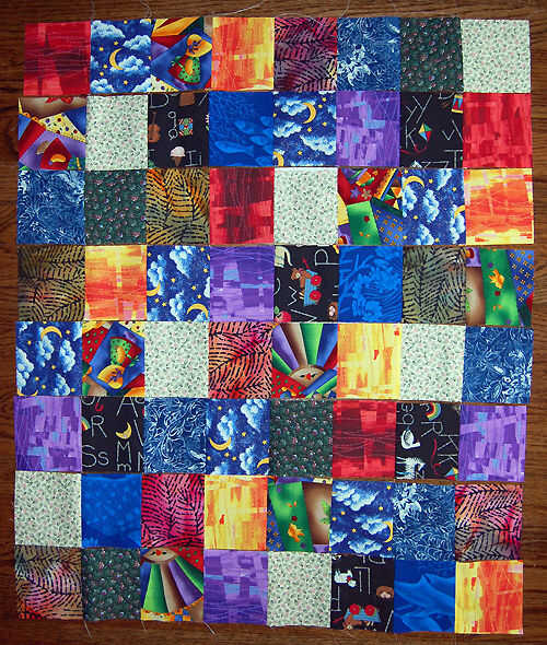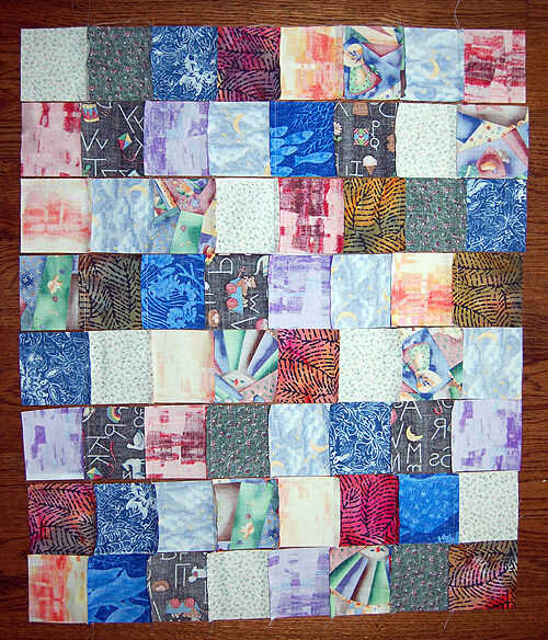 ordenó un montón de triángulos de troquelado de un catálogo y cuando llegaron, hubo muchos, muchos pares de tela que empareja. Después de mucho cambio de piezas, decidí "pedazo de la tira" una colcha de bebé bloque. Aunque difícil de ver, se con