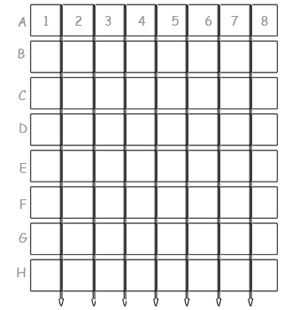 Ahora, tomar la pila de tres y mantener las plazas ya cosidas en la parte inferior, coser un cuadrado de pila de tres para cada plaza de la pila 2, sin romper el hilo. Continuar con cada pila, hasta que tenga ocho filas (A-H), conectadas con el hilo, como se muestra a continuación. Pulse las costuras.