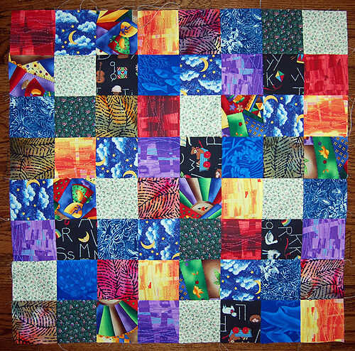 Cuando está cosida la parte superior de la colcha, presione desde la parte trasera y delantera una última vez. Haceos el forro tela bocabajo, lugar bateo arriba de eso, luego la parte superior de tejido en la cara de bateo. Eliminar cualquier arruga y fíjelos con pasadores de seguridad grandes. Edredón de la máquina en cualquier patrón, tejido de mano o bordada con hilo. Recortar los bordes con cuchilla giratoria.
