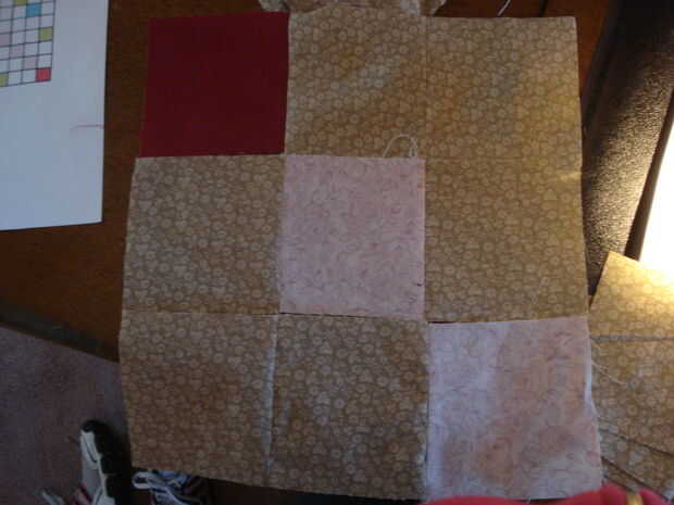 Combinan un marrón con rosa (hacer 8). Tomar 4 de estos dúos y coser otro marrón para el color de rosa (Rosa está ahora en el centro). Tome las restantes 4 piezas y coser un marrón a un color marrón (color de rosa es en el extremo). Ahora estás listo para hacer el bloque!
