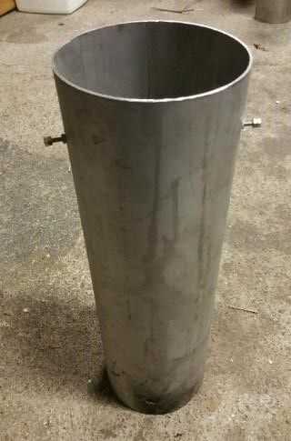 Empecé con un cilindro de acero inoxidable con diámetro interno de 140 mm y altura de aproximadamente 500 mm. Tiene unos 2 mm de espesor. La sección transversal de la cámara no importa. Cualquier forma va a hacer. Si desea fumar durante mucho tiempo, asegúrese de que tiene suficiente capacidad. Tenga en cuenta los tornillos que montan a cada lado del cilindro. Estos utilizo para unir la puesta a punto todo terminado para evitar derribar y crear una situación peligrosa con madera que brilla intensamente.
