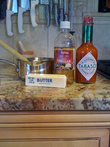 Ir a su tienda local y comprar estos artículos: Tabasco/louisiana hotsauce, mantequilla, vinagre, pechuga de pollo, la harina y aceite vegetal. Para hacer la salsa necesita hotsauce 1/3 taza, 1/4 taza de mantequilla y 2 cucharadas de vinagre. También si usted no quiere hacer un ala salsa o ya la tienen en una botella puede usar eso.