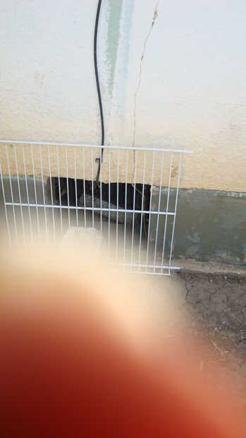 Aquí utilizó un estante del refrigerador para los respiraderos de la Fundación.  Funciona muy bien y mantiene animales entren en la casa.    Él utilizó una piedra para apoyarlo.