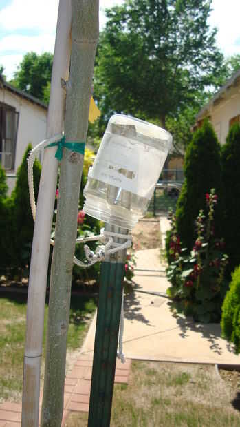 Aquí utiliza un frasco de vidrio para proteger una corteza de árboles jóvenes de raspado contra un poste metálico.