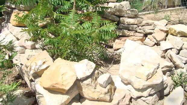 Aquí hizo parterres elevados utilizando su colección de rocas encontró.  A trazado de la frontera con las rocas y lleno de suciedad.  La siguiente foto sólo apilados encima de un montón de rocas y lo dejó así.  Supongo que piensa en llenar con otros arbustos y flores.  Casi parece una fuente.