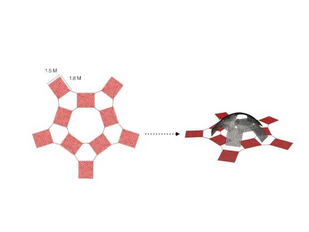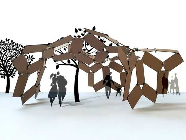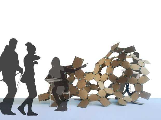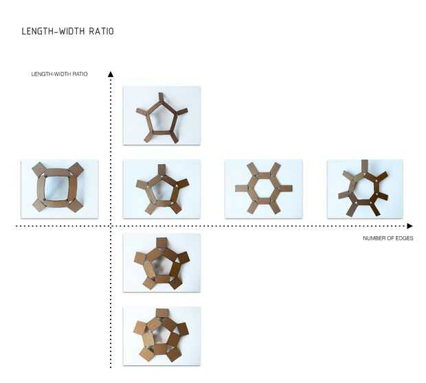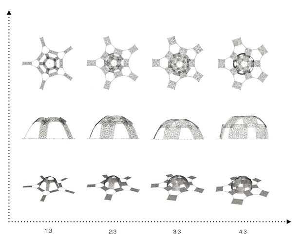 Nuestros estudios de caso iniciales de Plydomes nos han llevado a explorar cómo flexión propiedades de los materiales de superficie plana y la variación de los parámetros de fabricación podría tanto ser utilizado para generar diferentes formas. Estas variables tres formas dimensionales se ligan por el método escalable de tornillos y pernos, aplicables a una variedad de espesores de material.