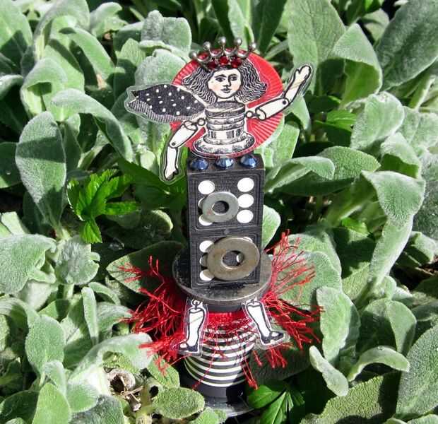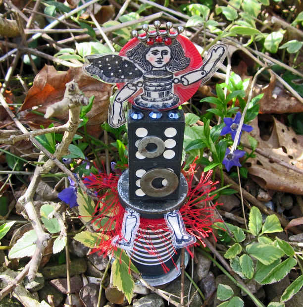 esta muñeca de ensamblaje se hizo con varias fuentes. Cuerpo de la muñeca fue creada con un carrete de madera grande, un pedazo de juego torre apilando, un domino de madera antiguo y una ficha de juego de poker rojo. El conjunto está adornado con cuatro arandelas de metal, tres negros y tres rojo rhinestones, una corona de metal, hilado de la pestaña roja y papel diseño rayas. El cuerpo de las muñecas es un sello de goma de una estampilla en la mano llamada a "chica de la botella de tinta".