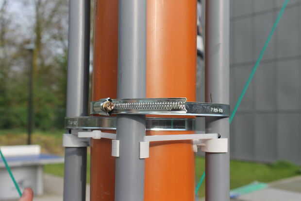 Conecte los 4 tubos colocando correas a través de los 8 agujeros a 50cm desde el principio. Esto evitará que las tuberías da vuelta alrededor de demasiado. También Coloque las correas del metal alrededor del tubo para la fuerza adicional / seguridad.