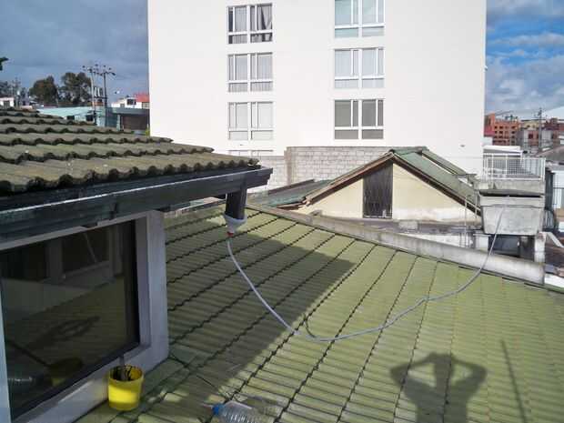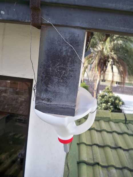 Un embudo y una manguera redirigirá el agua desde el techo al tanque