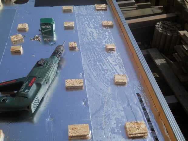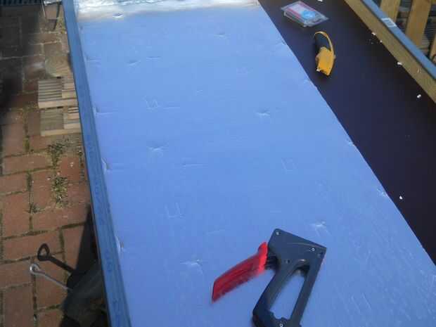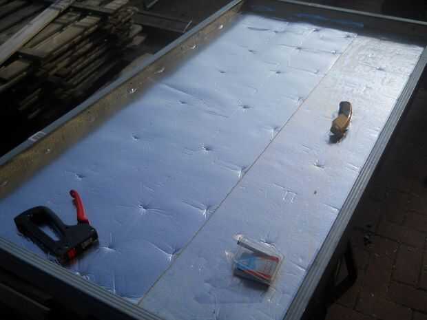 Para el aislamiento, usar material, normalmente pones detrás de radiadores. Todo solucionado en el marco. Los pequeños trozos de madera crean una distancia detrás de la espalda y las chapas. Unos agujeros para succionar aire fresco temblaban con la pantalla de la mosca