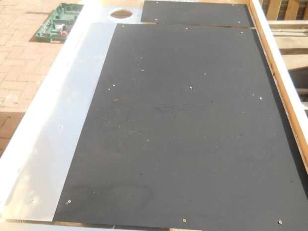 La placa de metal es aluminio 0,5 mm, pintado en negro y fixedon los pequeños trozos de madera.