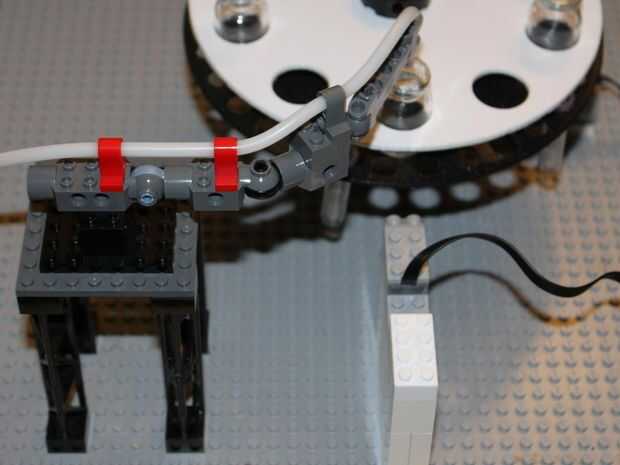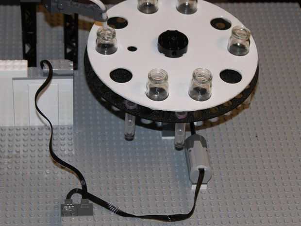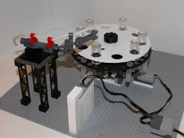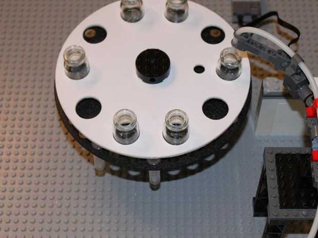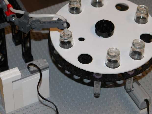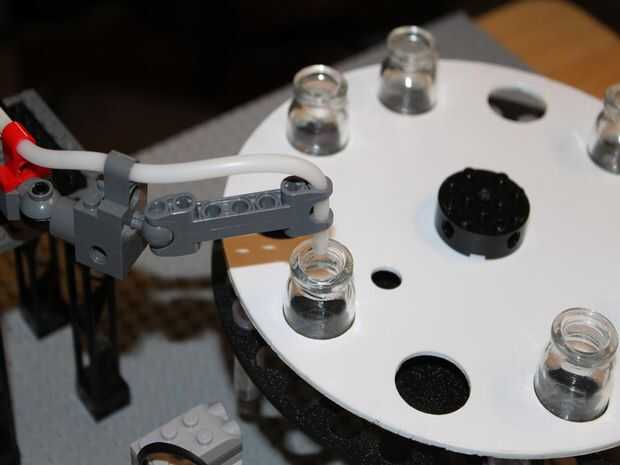 Esto asegura que la botella de cristal se detendrá bajo el brazo de entrega de la muestra.