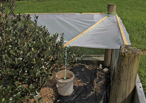 Este colector de lluvia es una hoja de dos metros cuadrados de plástico doblado por la mitad, por lo que para cada milímetro de lluvia tengo un litro de agua para mi jardín.