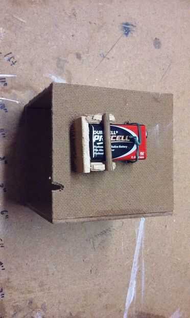 Al lado del caso añadir ranura para cables y un medio de mantener la batería. Como se puede ver, sólo utilicé algunas piezas pequeñas de corte madera y twist tie para la batería.